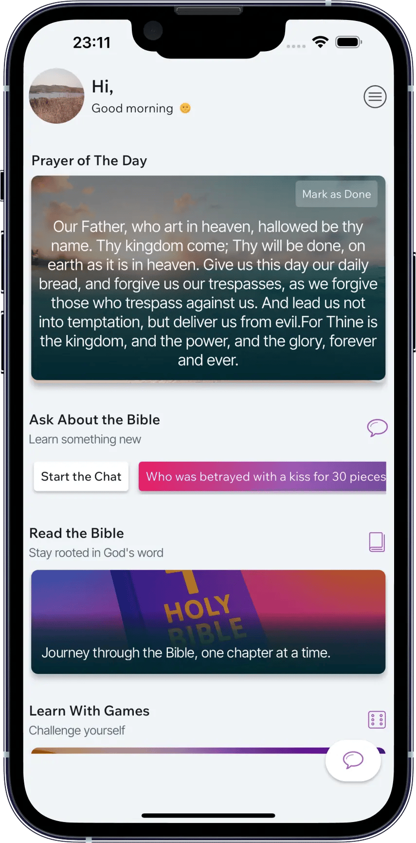 Pray, read, ask questions, and grow in your faith—all in one place. Start your day with prayer, explore God’s Word, and test your knowledge with fun Bible games
